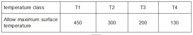 مضخة الصرف الصحي الكهربائية الغاطسة المقاومة للانفجار هذه تحمل علامة ExdIIBT4/ExdIICT4، وهي مصممة للاستخدام في المصانع من فئة IIB/IIC، حيث توجد مخاليط متفجرة من الغازات القابلة للاشتعال أو البخار والهواء في درجات حرارة تتراوح بين T1 وT4. يجب أن تتوافق أقصى درجة حرارة سطح للوحدة مع المواصفات الموضحة في الجدول أدناه.